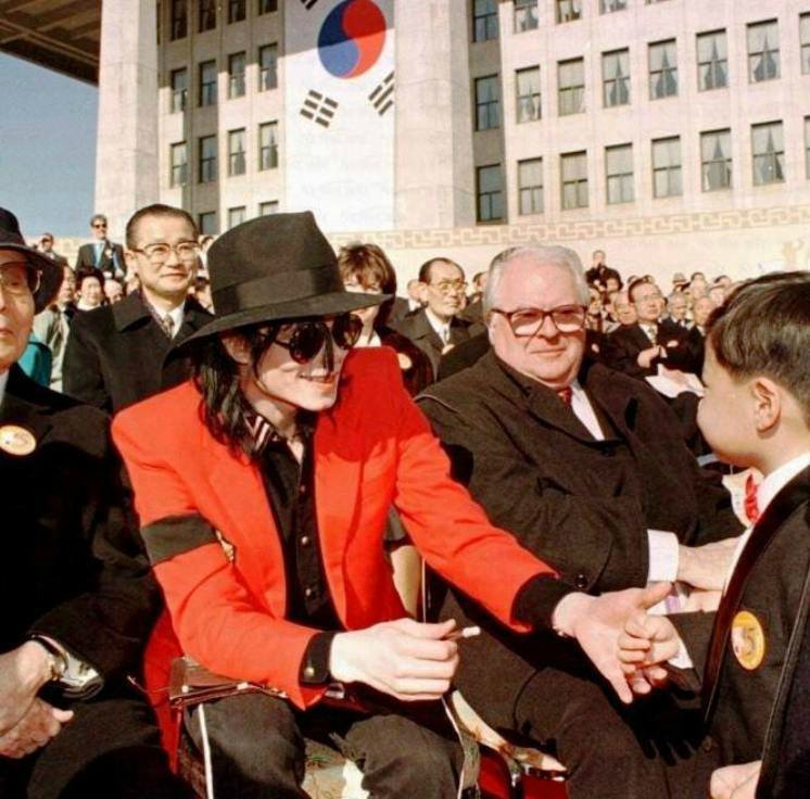 Le 25 février 1998: Michael Jackson assiste à la cérémonie d’investiture du président Sud Coréen d’alors, Kim Dae-Jung. Michael se retrouve assis auprès de Pierre Mauroy, ancien premier ministre français (à lire ici).